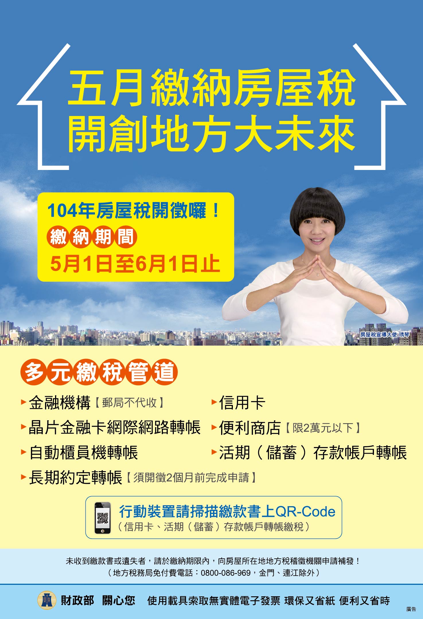 104年房屋稅將於104年5月1日開徵,繳納期限至6月1日截止(原至5月31日,適逢例假日順延一天)。臺灣省政府籲請納稅義務人或代繳義務人應於收到房屋稅稅單後於期限內,利用信用卡、ATM、網路、電話語音或至便利商店、代理...(詳全文) |
