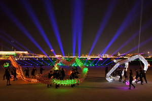 南投燈會元宵新春特別演出3日晚間出動了無人機高空排列2020、NANTOU、錢鼠、愛心及燈籠等圖案,同時搭配水面上的幻彩水舞秀,水空聯演,帶來充滿驚喜的視覺享受。而首演的Comingtrue火舞團,及多次獲獎並受邀各大型活動演出的營北國中夜光舞龍隊及佳吟舞蹈團等優秀團隊精湛、震撼的演出,更是讓燈會活動達到最高潮。