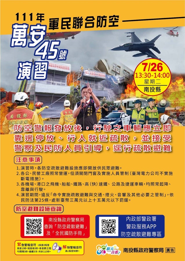 111年軍民聯合防空(萬安45號)演習中部(南投縣)地區定於111年7月26日(星期二)13時30分至14時實施。防空警報發放後,行駛之車輛應立即靠邊停放、行人就近疏散,並配合警察...(詳全文) 發佈日: 2022-07-18 |